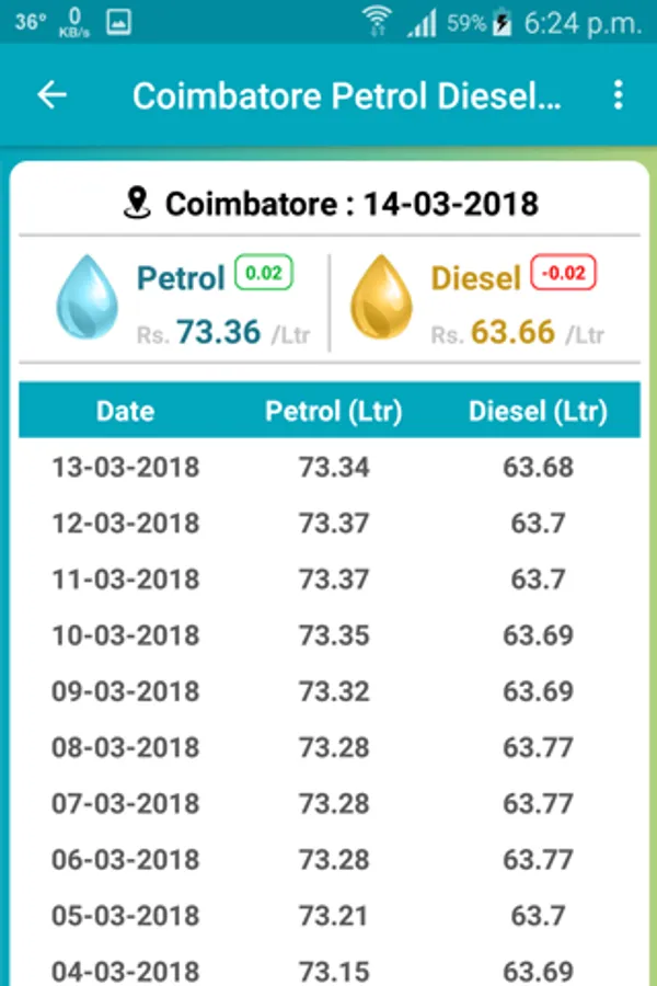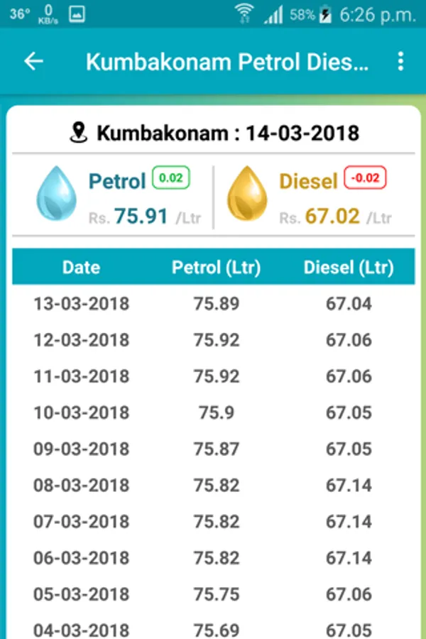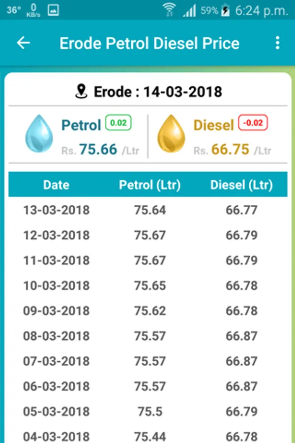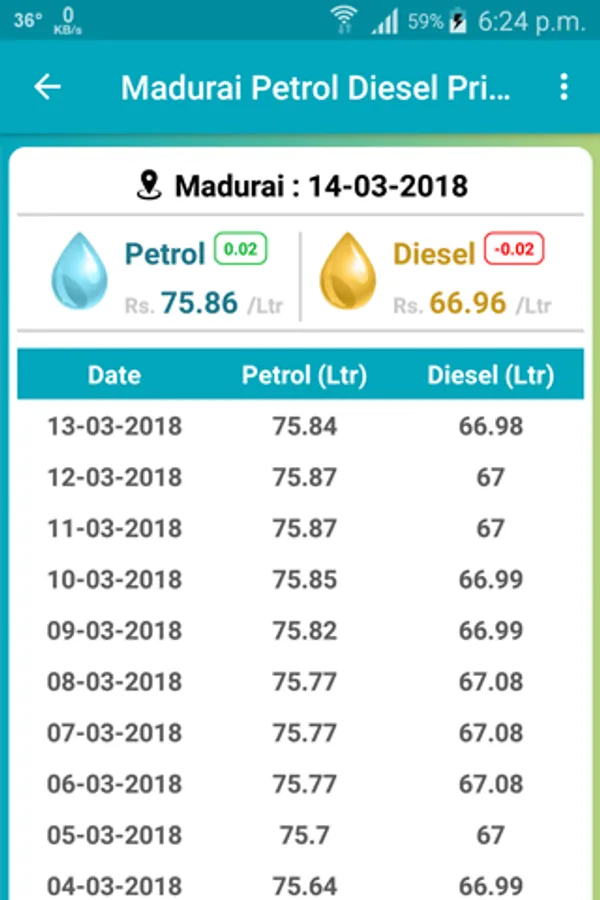 This is simple app give you Petrol, Diesel daily price in Major cities of tamilnadu like Chennai, Madurai, Coimbatore, Trichy, Erode, Tiruppur etc.