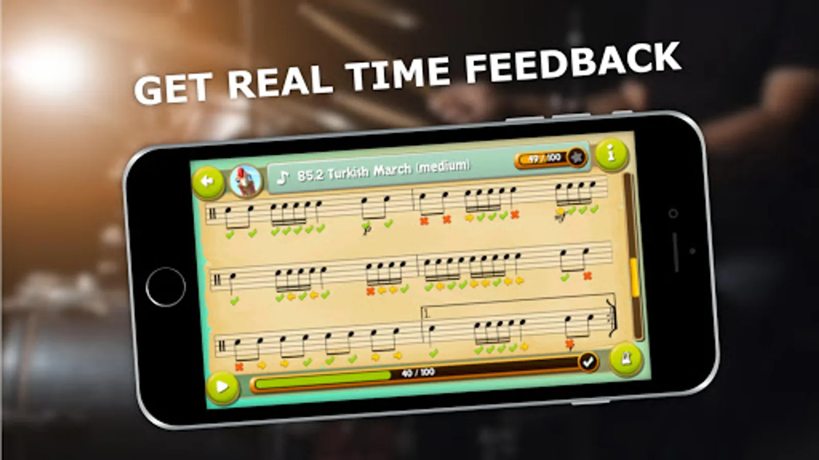 The app is listening to your drumming and gives real-time feedback on your timing. The end of the exercise is followed by insightful feedback and the popular scoring. This makes practicing much more effective and more fun!