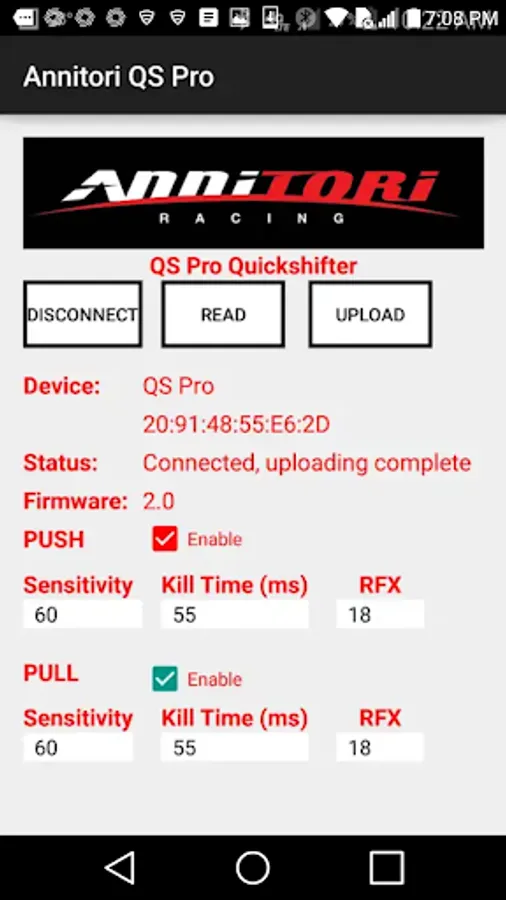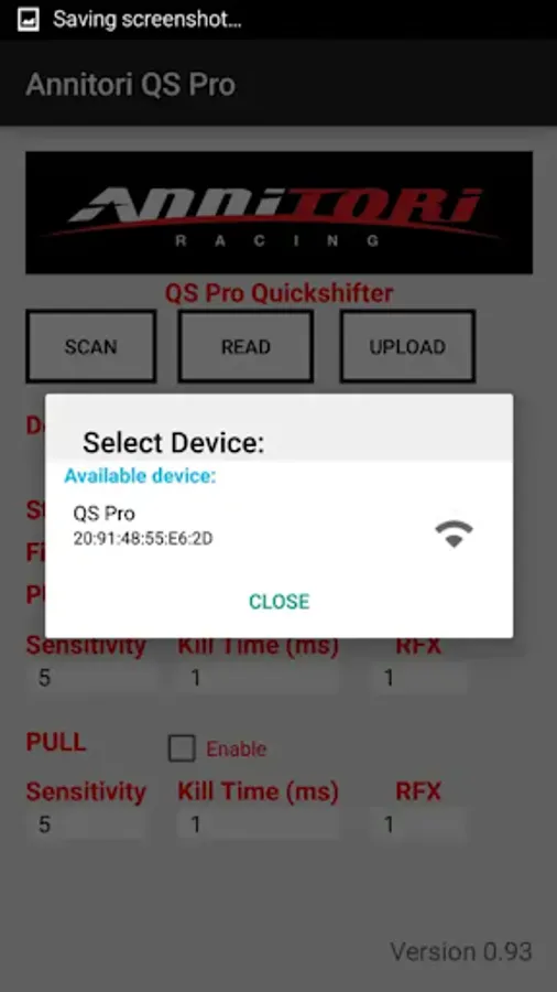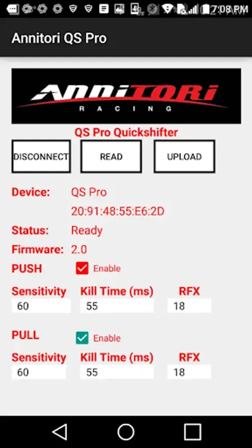 7) You will see your “MAC” address pop up, this is the number that appears in the box as in this image. This number is the unique number that identifies your QS PRO shifter. When this appears, the app has found your shifter.