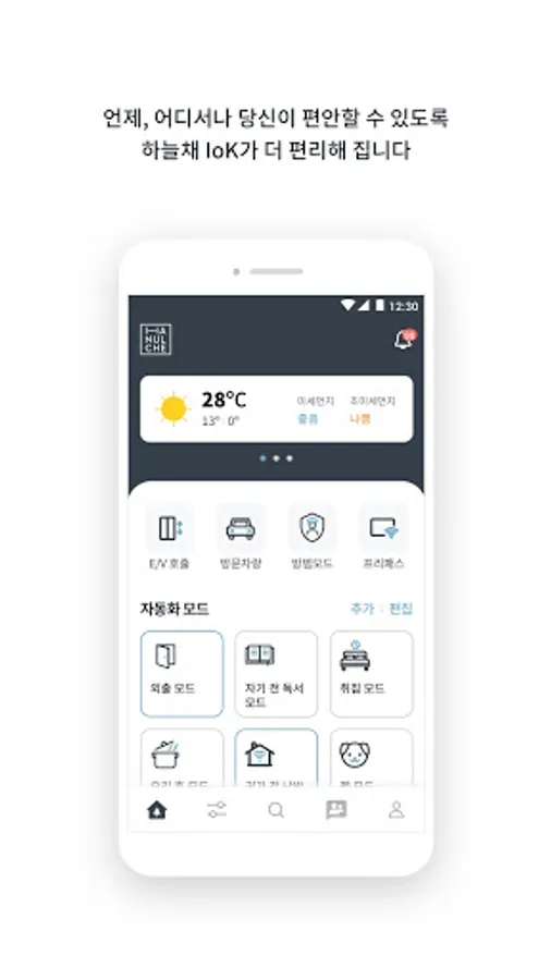 Smart Skychae IoK checks and controls the condition of the house and provides various housing services by interworking with home network devices and smart home appliances in the house anytime, anywhere, both inside and outside the house. Enjoy a smart life easily with a dedicated smart skychae mobile app.