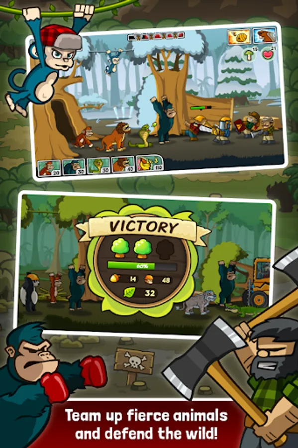 In this free action-packed defense game you help Koko Kornelius, the mad and brave monkey to defend his homeland from wicked lumberjacks! Discover, set free, upgrade, and evolve your minions to the ultimate animal army!