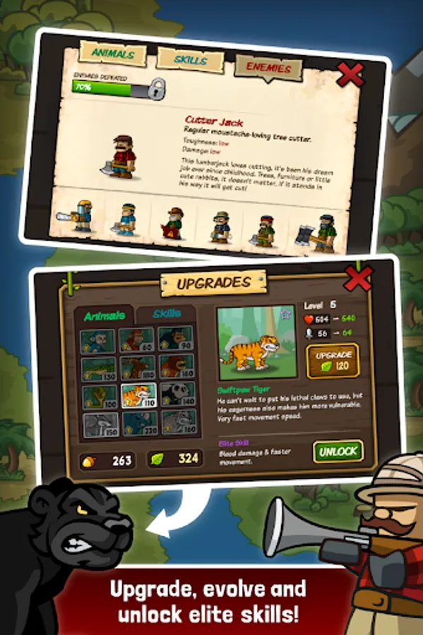 Discover and upgrade the Smashback Gorilla, Punchbag Panda, Backattack Alligator, Kickaroo kangaroo, Rock n’ Roar Lion, Swiftpaw Tiger, Snowtail Leopard and many more unique animals in this wild forest zootopia. All with there own special abilities and elite skills!