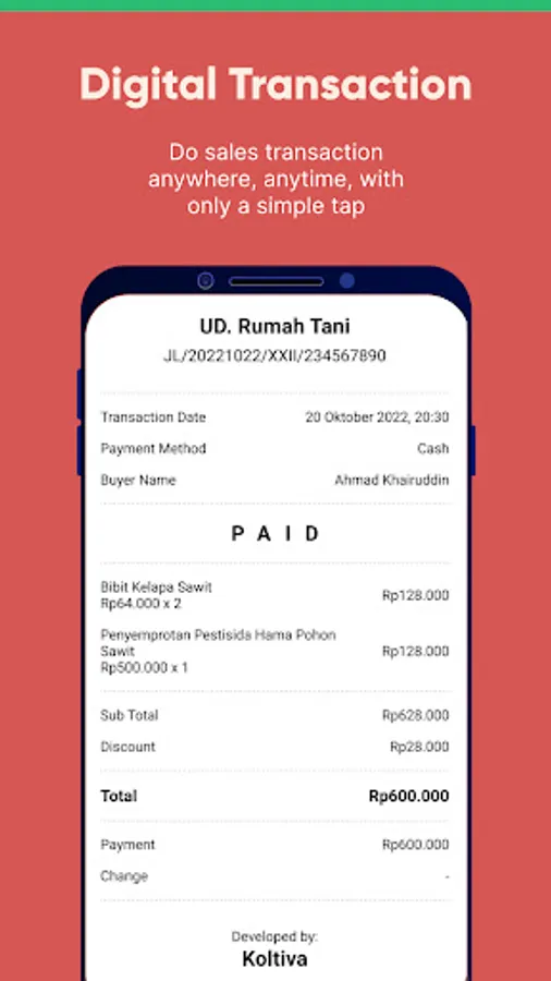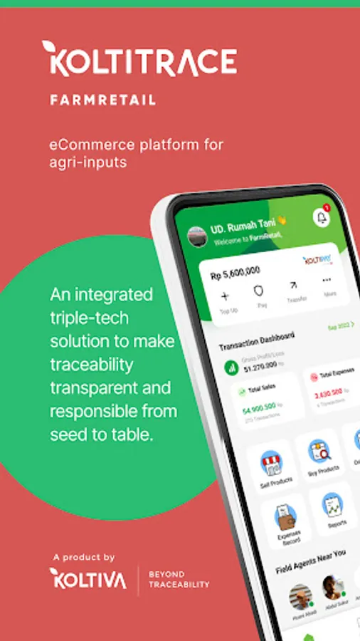 KoltiTrace FarmRetail is a mobile application that is connected to Koltiva's end-to-end ecosystem, which integrates a triple-tech solution for transparent and responsible interactions between farmers, suppliers, and agribusinesses.
