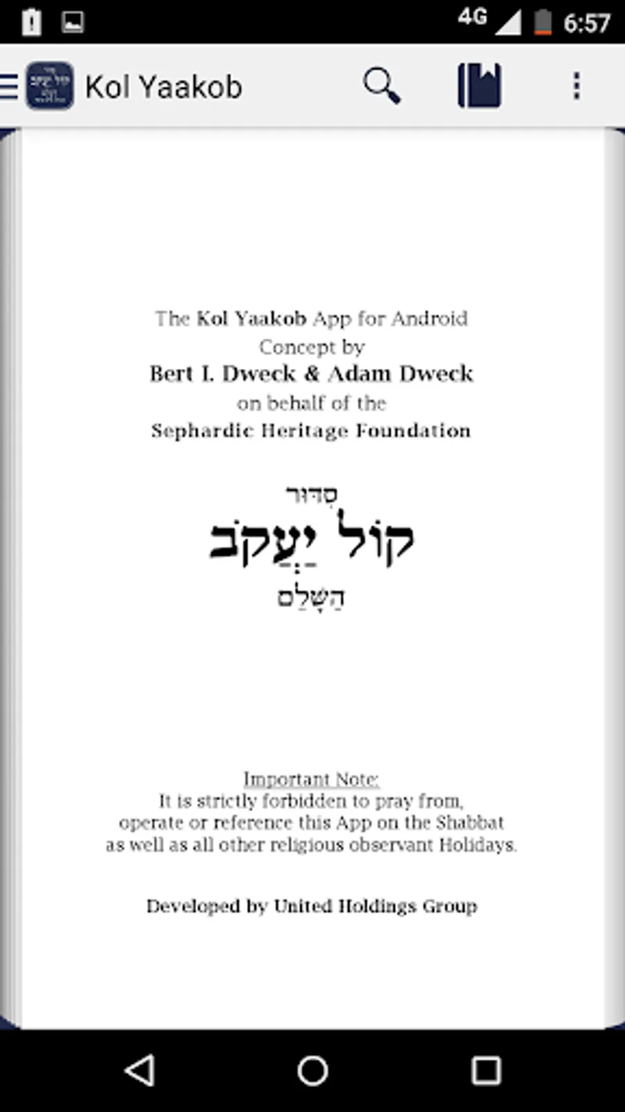 It is strictly forbidden to pray from, operate or reference the Kol Yaakob Siddur App on Shabbat and all the other religious observant Holidays.