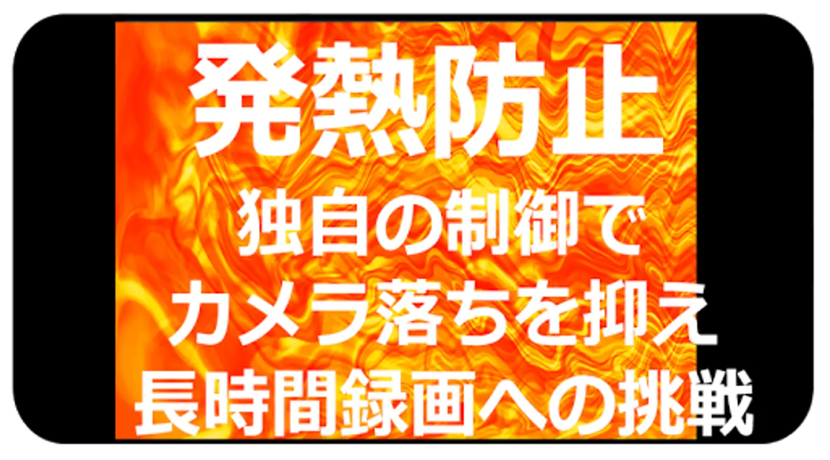 アプリ起動後に「設定」を行えば、高画質長時間録画で発生するカメラ落ちの原因となるスマートフォンの発熱を極力抑えることが出来ます。映像と音声を別々に記録し録画終了後に自動でミックス(多重化)すれば発熱を極力抑えることが出来ます