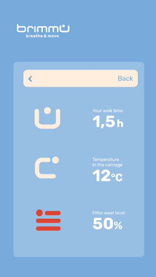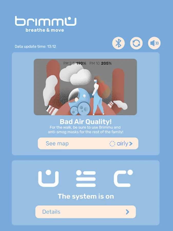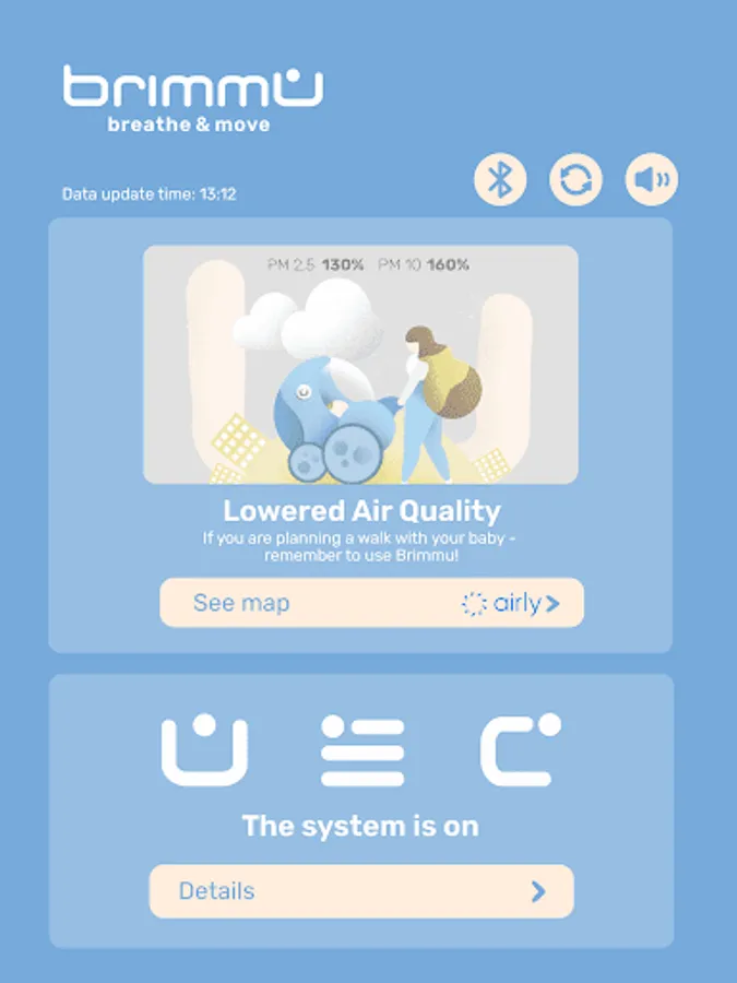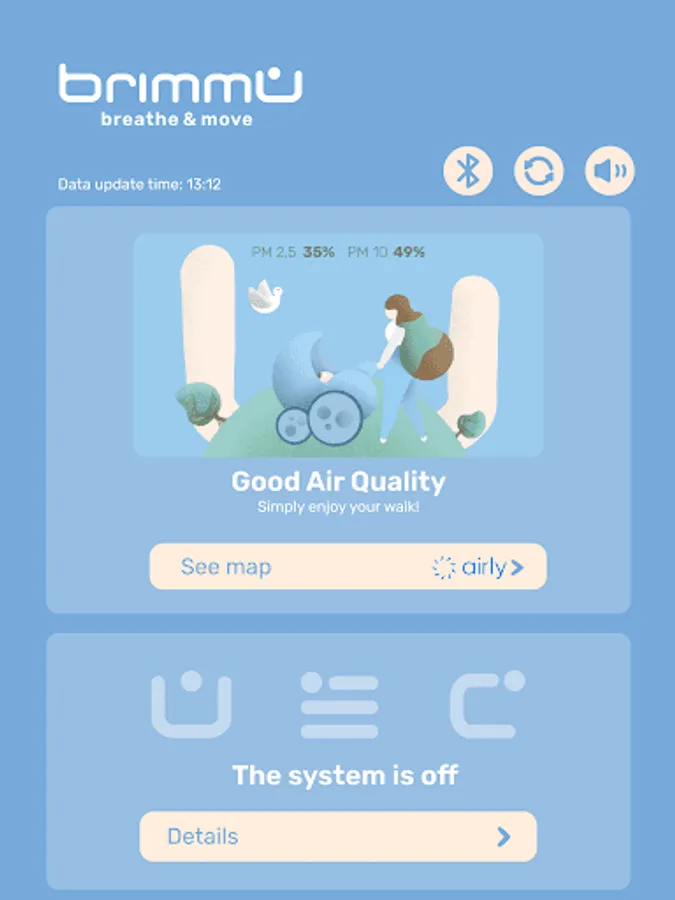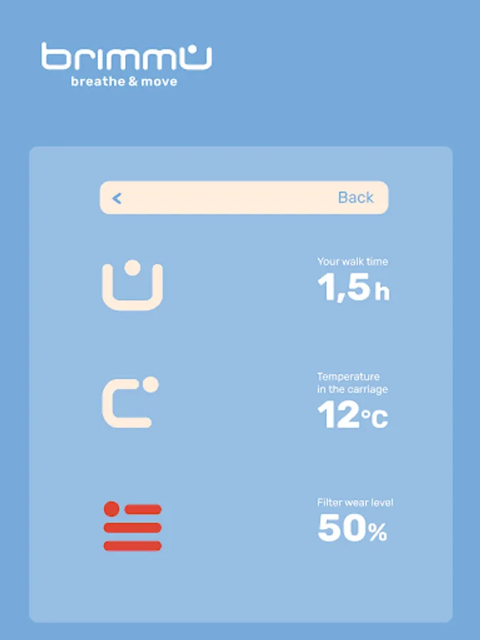 The application connects via bluetooth to the BRIMMU device, which is a carriage shield with a filtrating system that protects babies from air pollution during walks. The application shows the parameters of the system, such as: the duration of the walk, the filter performance and the temperature inside carriage. In addition, it connects to Airly international air monitoring data base in order to show the current air quality in users area, indicating the need to use the device.