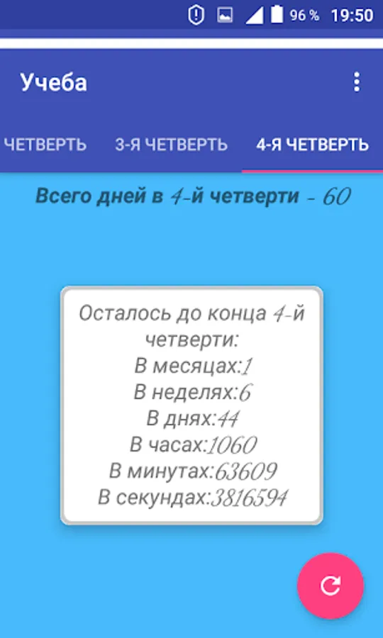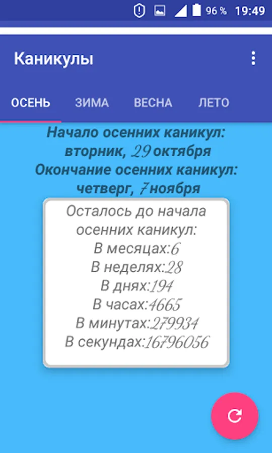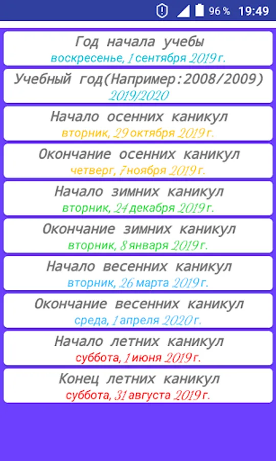 Want to know how much time is left before the start or end of a vacation or quarter? Then the application School Goodbye !, what you need! With it, you will know how much time is left in weeks, days, hours, minutes or seconds before the start or end of the event.