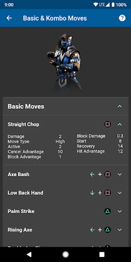 - Learn: Inputs for basic moves, special moves, abilities, kombo moves, fatalities, and brutalities, frame data