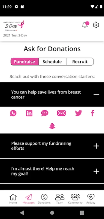 Do your fundraising on the go with your Susan G. Komen 3-Day application. Update your personal page, send emails, and check your fundraising progress – all from the palm of your hand. The Komen 3-Day application is a great tool to track your fundraising progress, and to keep current on all 3-Day news!