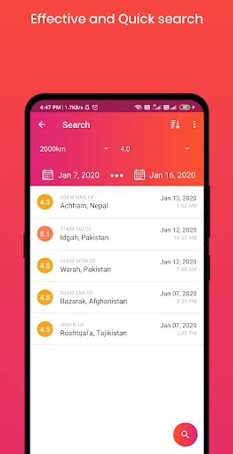 ● Search: You can search through earthquakes based on various parameters like starting date, ending date, Minimum magnitude, radius Filter, and sorting filters