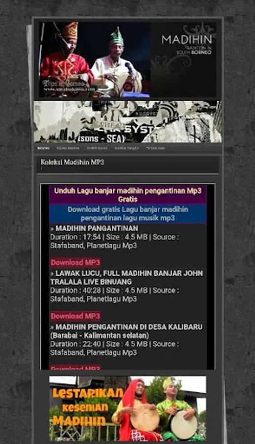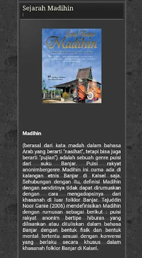 Derived from the word madah in Arabic which means "advice", but it can also mean "praise") is a genre of poetry from the Banjar tribe. This anonymous folk poem with Madihin genre only exists among Banjar ethnic groups in South Kalimantan alone. In this connection, the definition of Madihin cannot be formulated by adopting it from treasures outside of Banjar folklore. Tajuddin Noor Ganie (2006) defines Madihin with the following formulation: anonymous folk entertainment type which is written or written in Banjar language with certain physical forms and mental forms in accordance with the applicable conventions specifically in the treasures of Banjar folklore in South Kalimantan.