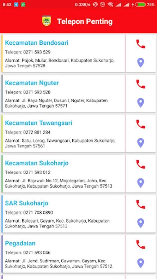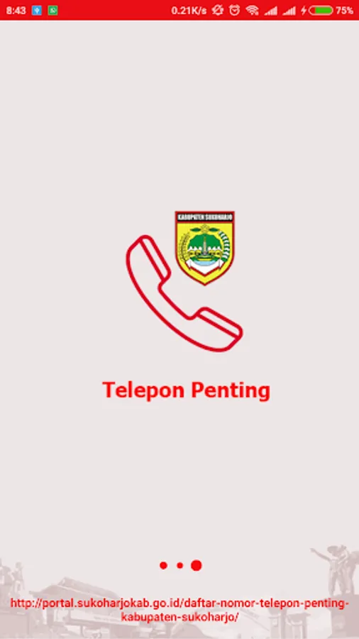 Important Phone Application is an application that lists telephone numbers and office addresses in Sukoharjo Regency. In this application can navigate the location via Maps and can direct phone numbers through a smartphone.