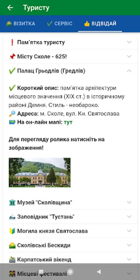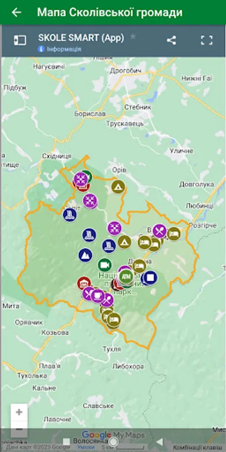 The application was created with the aim of promoting the tourist attraction of the Skoliv community (in general, tourist interest in the Carpathian region of Ukraine), as well as improving communication between the local administration and community residents. The application works in Ukrainian and English.
