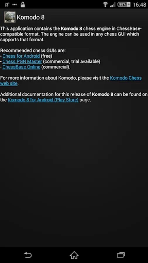 BEFORE YOU PURCHASE: NOTE THAT KOMODO 8 FOR ANDROID REQUIRES A CHESS GUI (for recommendations, see below).