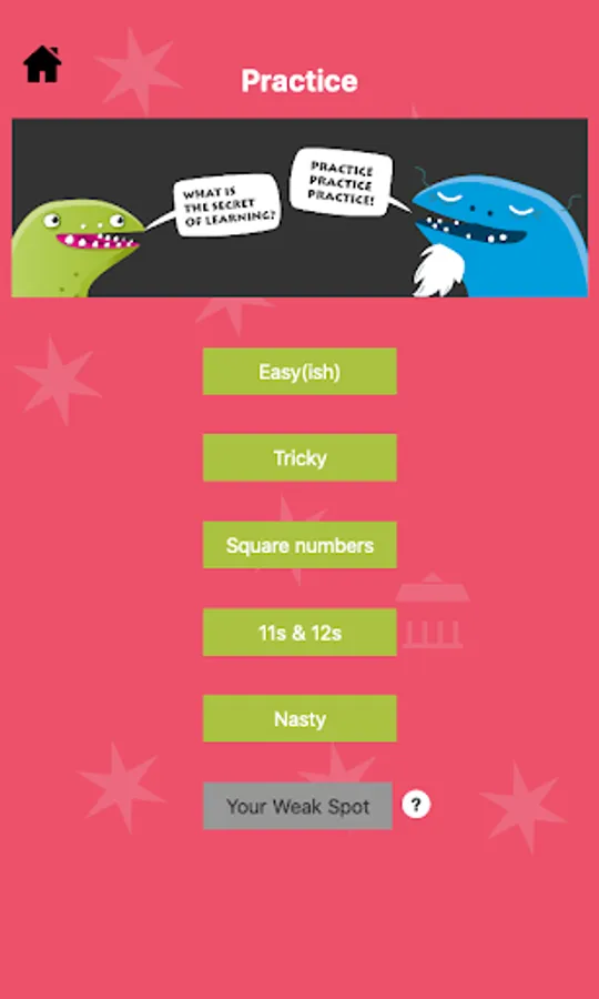 The practice section breaks down the 38 times tables challenge further into smaller practice tasks. These include: