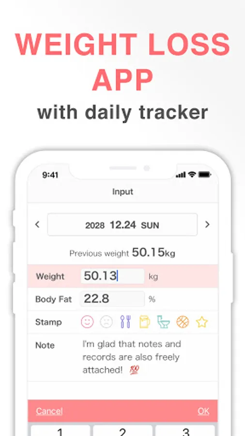You can customize the fields to enter by selecting which information you want to record. You can stick to the weight calculator only. Or try notes: they come with a huge storage so that you could add bmi tracking and belly fat loss, workouts, meals, poop, etc.