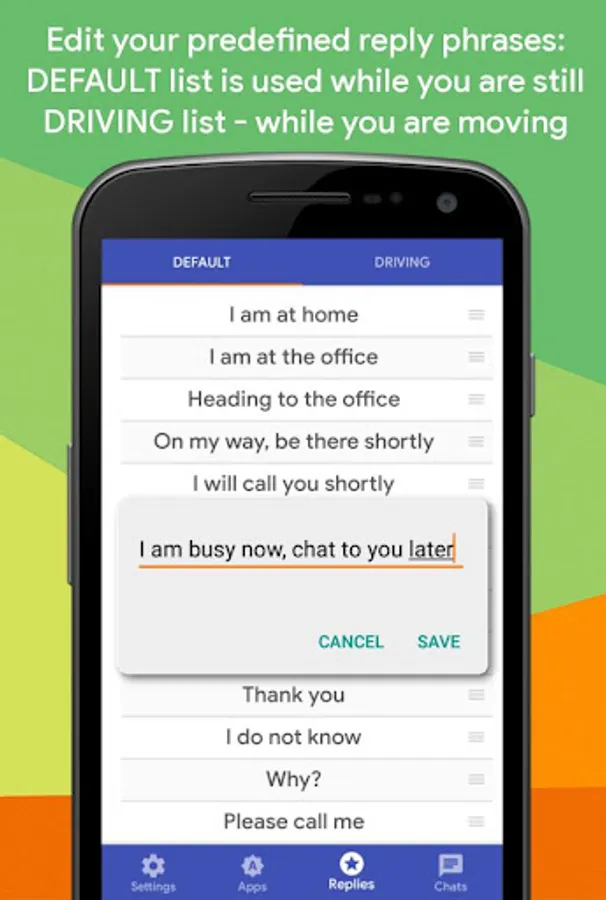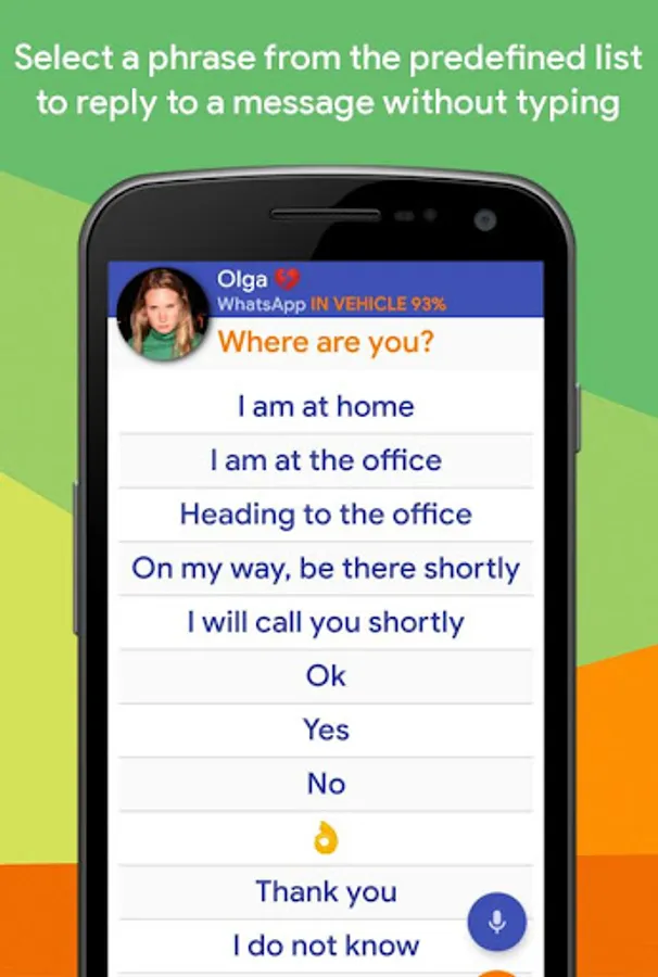 You can compose and reorder your replies in the phrase editor. Rocket Reply automatically detects when you are driving a car and brings a list of predefined phrases allowing you to select a response with a single tap. Do not worry if your car is not equipped with Android Auto. Rocket Reply can speak to you through a standard audio system.
