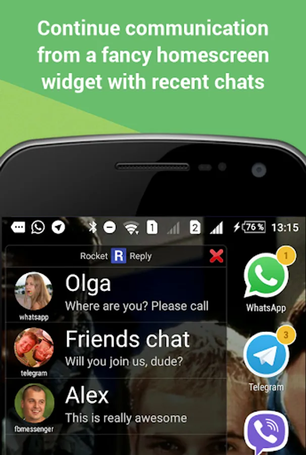 Rocket Reply supports WhatsApp, Facebook Messenger, Viber, Telegram, Hangouts, Threema, Textra, KakaoTalk, Line, WeChat.