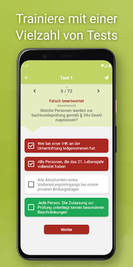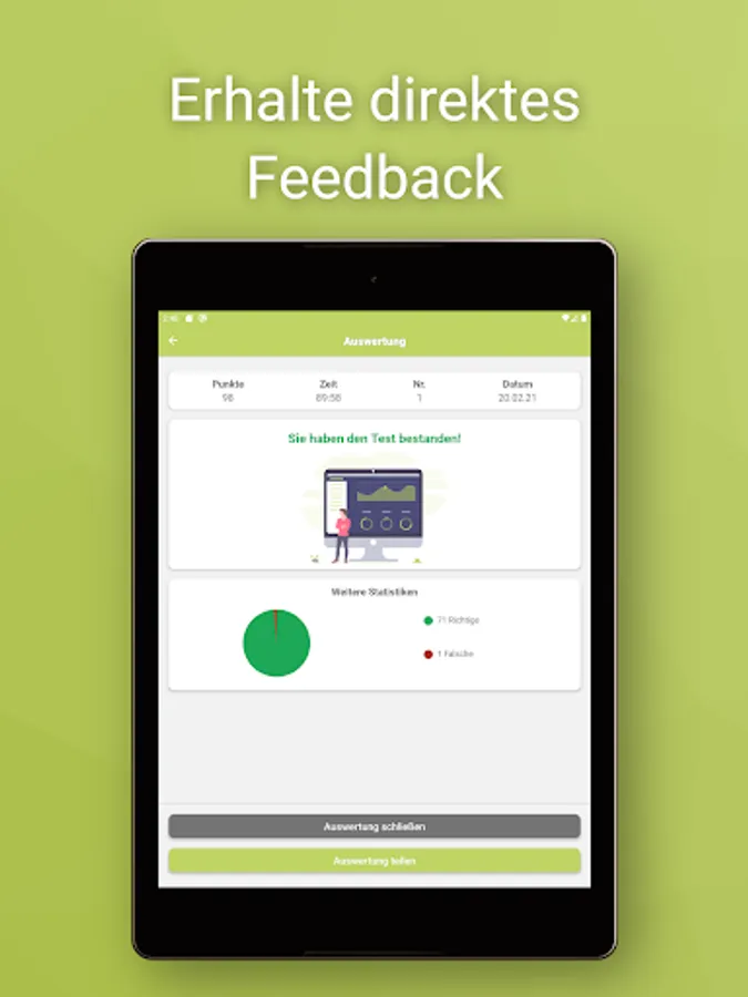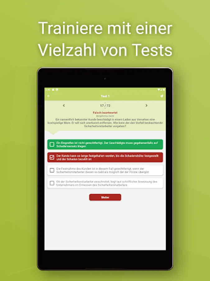 You can expect over 50 different practice tests from the exam-relevant catalogs of questions according to §34a GewO. You will receive direct feedback on your answers during a practice test.