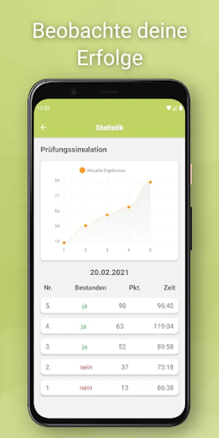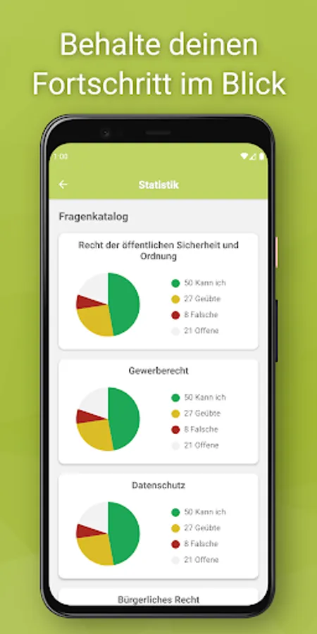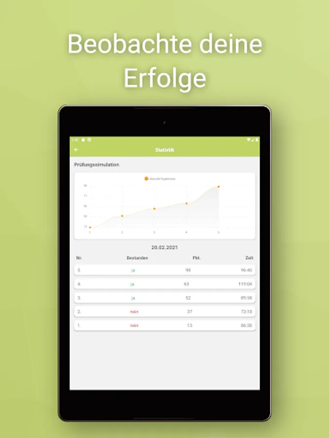 With the help of our index cards you will learn over 1500 questions from 9 questionnaires, before you put your knowledge to the test with over 50 practice tests in order to finally face the ultimate challenge - our exam simulation. You can share your achievements with your training manager, your colleagues and friends. Always keep an eye on your performance with our statistics. This is how you master the proficiency test!