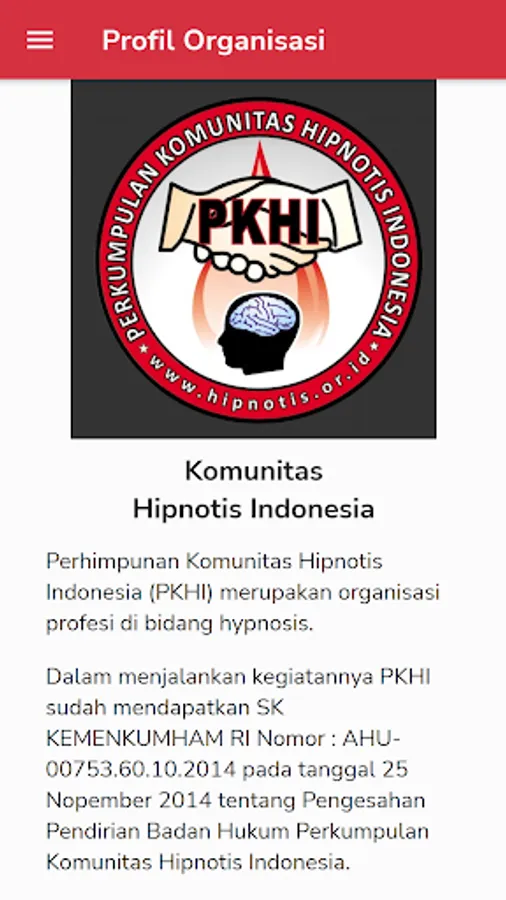 Dalam menjalankan kegiatannya PKHI sudah mendapatkan SK KEMENKUMHAM RI Nomor : AHU-00753.60.10.2014 pada tanggal 25 Nopember 2014 tentang Pengesahan Pendirian Badan Hukum Perkumpulan Komunitas Hipnotis Indonesia.