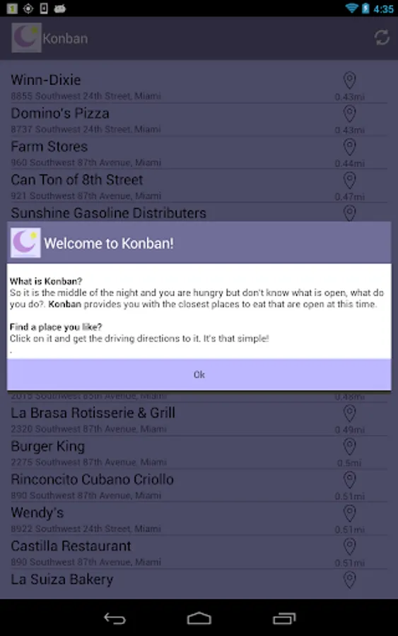It's late and night, you are hungry and have no idea what places are open at this time. What do you do? You let Konban find the places for you.