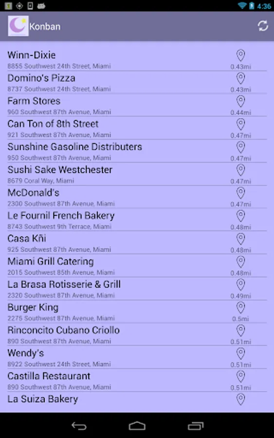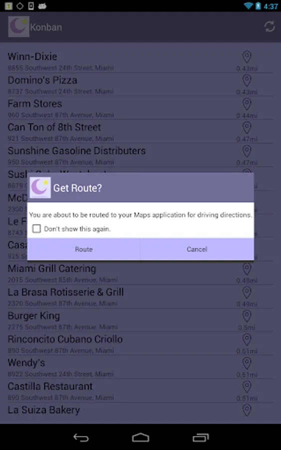 Konban provides you with a list of nearby places where you can eat. Get the list, pick a place, and get driving directions. It's as simple as 1, 2, 3.