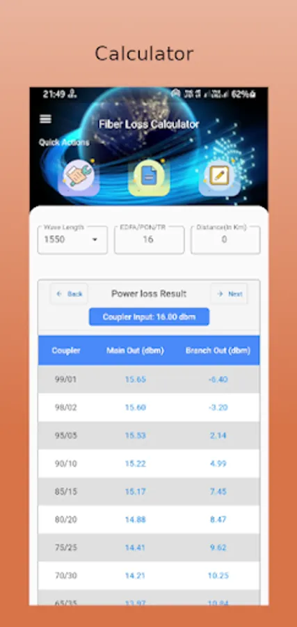 Fiber Loss Calculator helps you to calculate power loss of different couplers and design FTTH networks