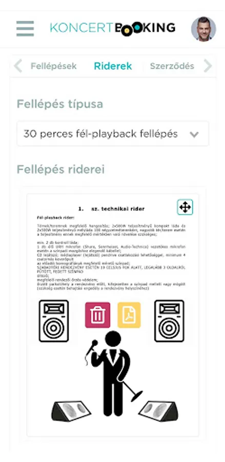 Concertbooking is a concert assistant. An application that performs as an assistant everything that may arise in connection with concert organization. It offers the production, calculates the price, makes a contract, makes an invoice, sends a rider and a press photo to the customer. Evaluate all activities related to the action. In the app, the manager or even the performer can assign technical staff or even session musicians to the concert. Alerts you to all the tasks you need to do.