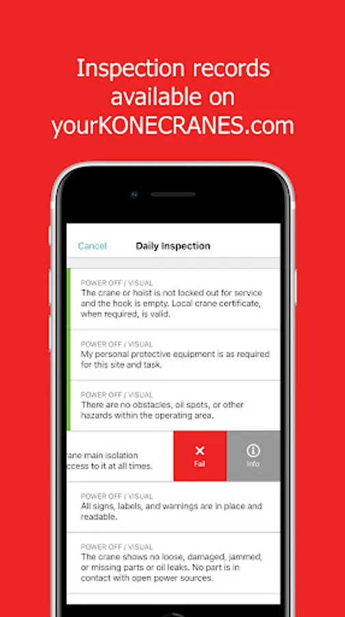 Konecranes CheckApp is a digitalized and cost-effective way for overhead crane operators to record daily or pre-shift inspection information. The daily inspection is an operator’s own assessment of the condition of an asset and environment for safe use. Daily inspections are statutory requirement in several countries and good practice for the safe operation of lifting equipment.