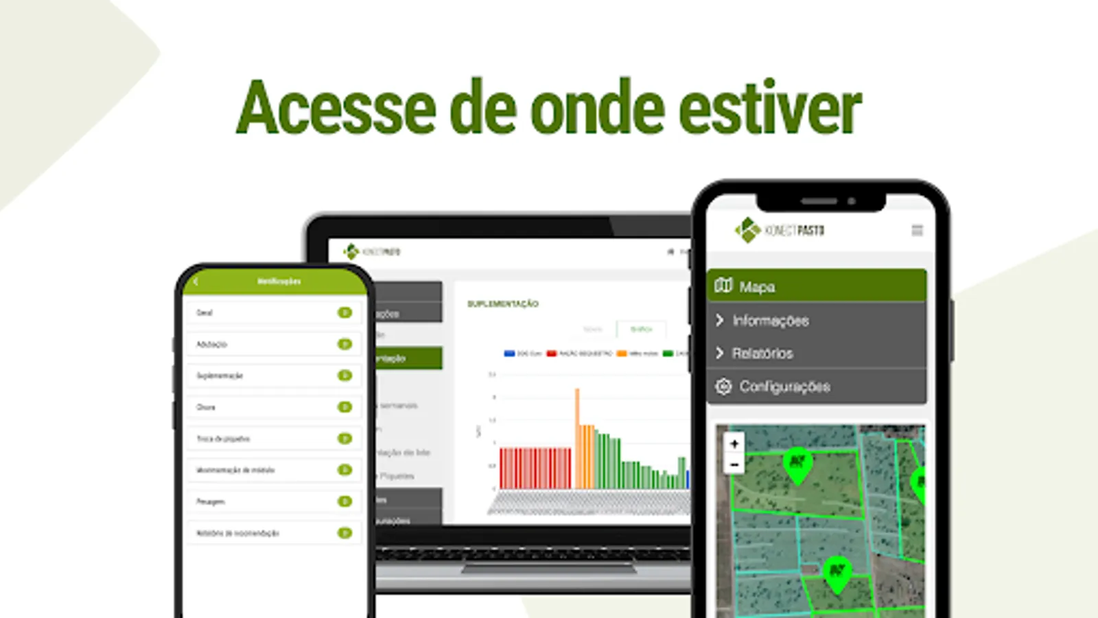 KonectPasto is a specialist system for intensive pasture management. The system consists of the use of the latest technology, such as data collection carried out through different hardware in the field and a software developed to assist in the monitoring of all the managements involved in the pasture production areas, such as animal movements in the paddocks, adjustments of stocking and supplementation, picket height measurements, rainfall record, fertilization, etc.
