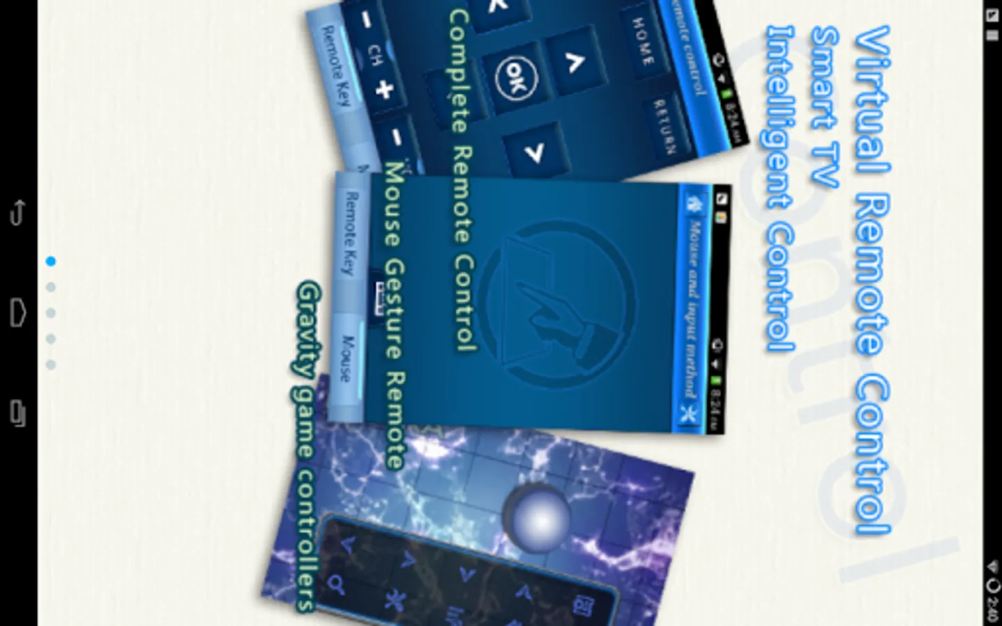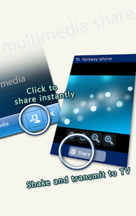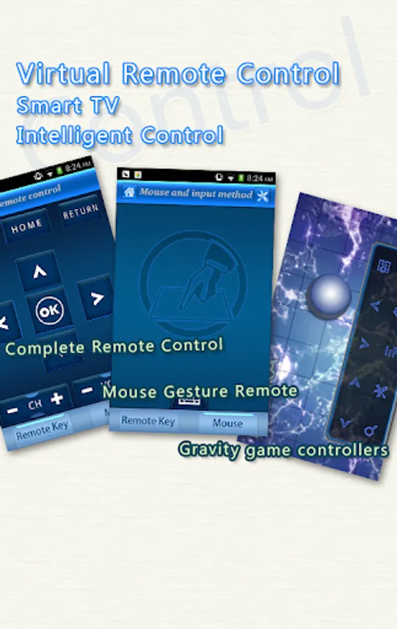 Control your Android TV intelligently. Throw your traditional remote control away. Control your TV by using the virtual remote control, virtual mouse. Share multimedia resources on your mobile phone. Play the somatic game in TV by using the smart Phone as joystick. Input the word to TV by tapping the keyboard in smart phone.