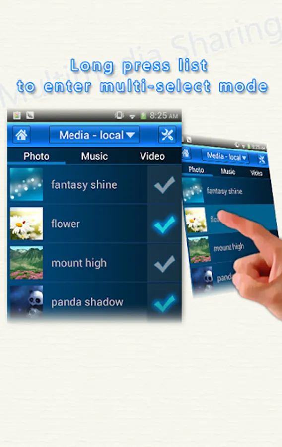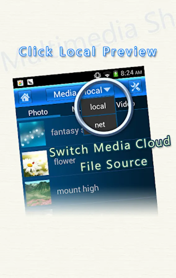 2)“Multimedia cloud share” module provides network resource sharing. Pictures on the mobile phone can be transmitted to the Android TV, and playback. Music and videos sharing is the same. You can also obtain the multimedia resources of other network equipment that connected with the Android TV.