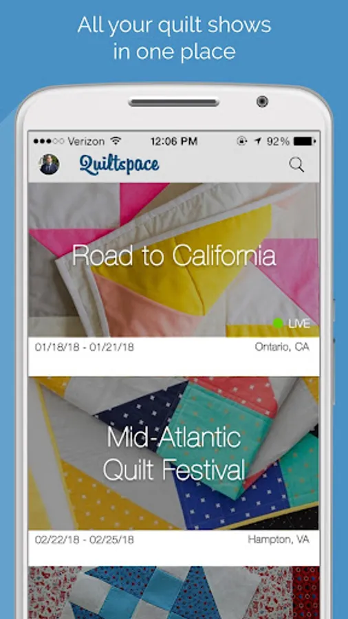 If you love quilting, this app is for you! Quiltspace is a free app that brings the world's most passionate quilters into one place. Attend quilt shows around the country, explore beautiful quilts, and share your experience with new friends and old.
