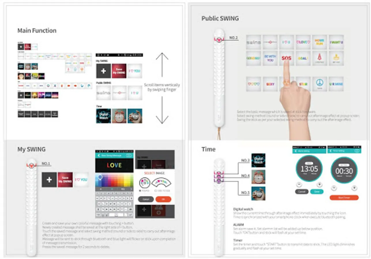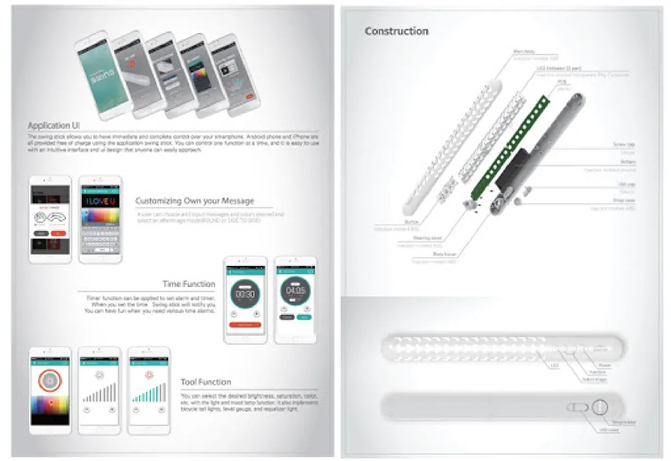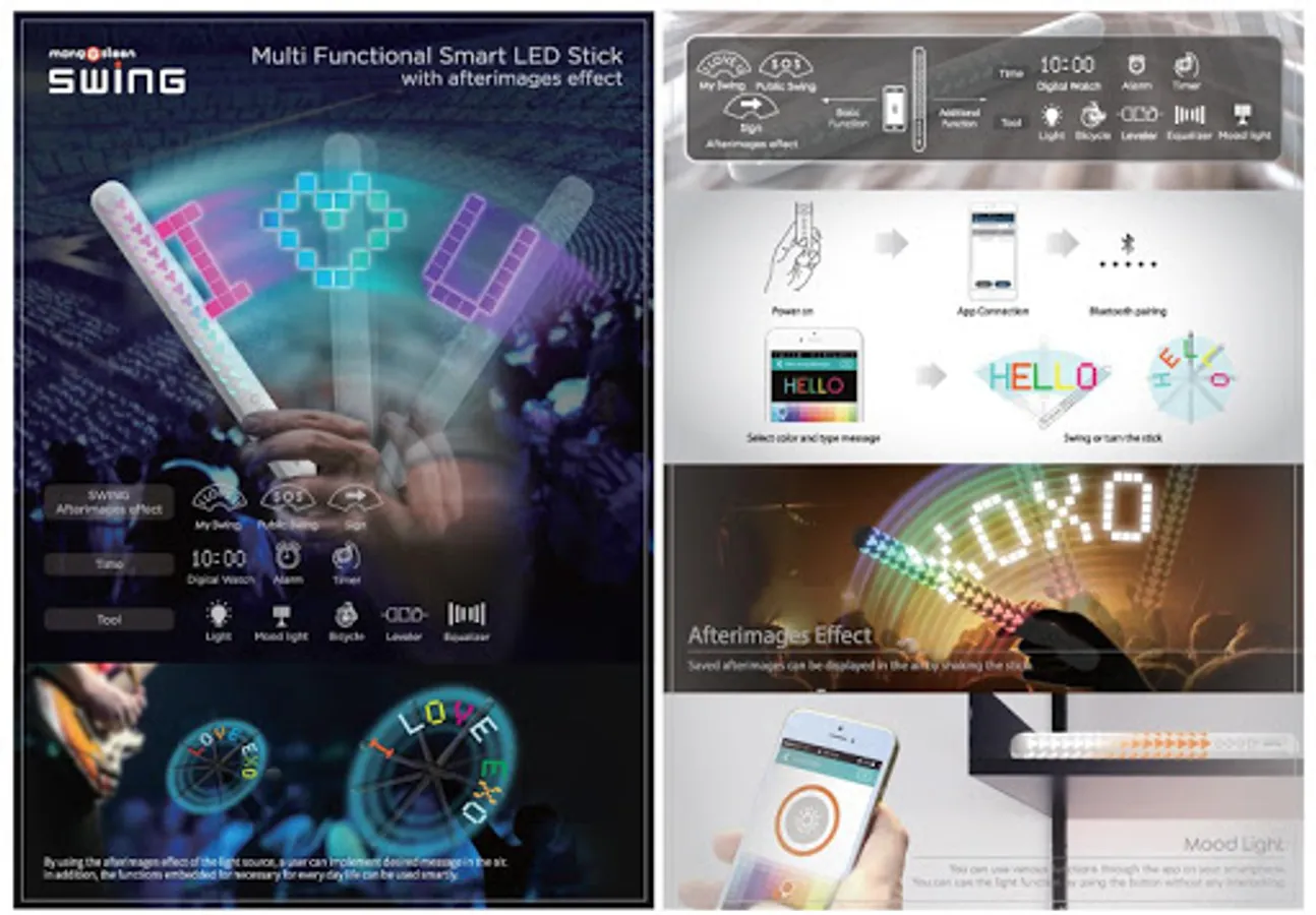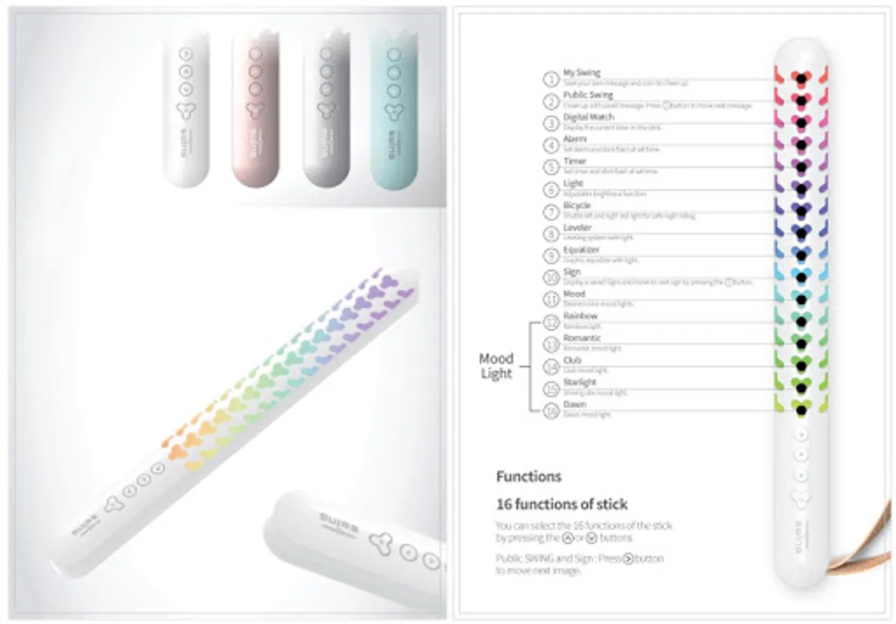 신개념 제품 SMART LED STICK - mangosteen SWING은 사용자가 원하는 색상 및 메세지을 입력하고 스틱을 스윙 또는 회전시키면 잔상효과를 활용하여 빈 공간에 LED 광원으로 사용자가 원하는 메시지를 구현할 수 있는 제품으로 콘서트, 페스티벌, 스포츠 경기에서 응원도구로 사용이 가능합니다.