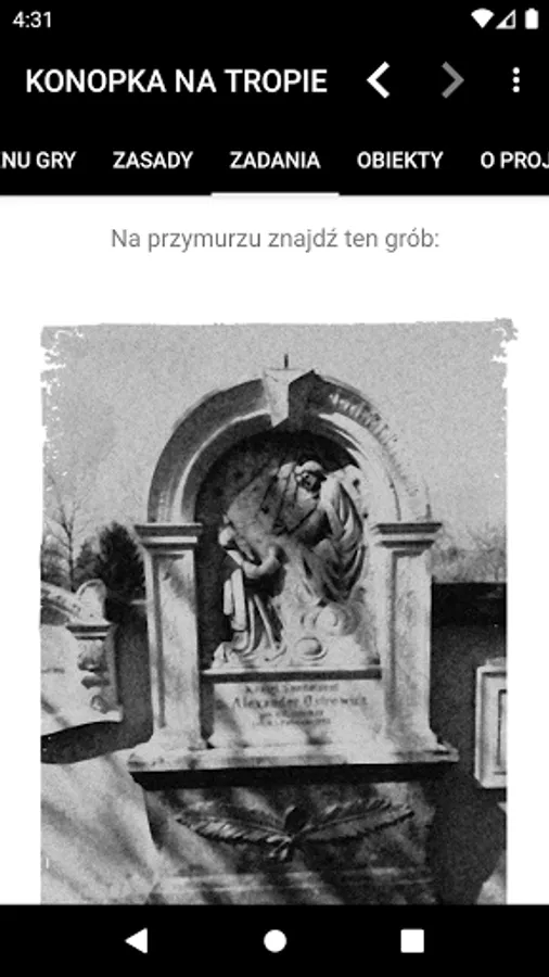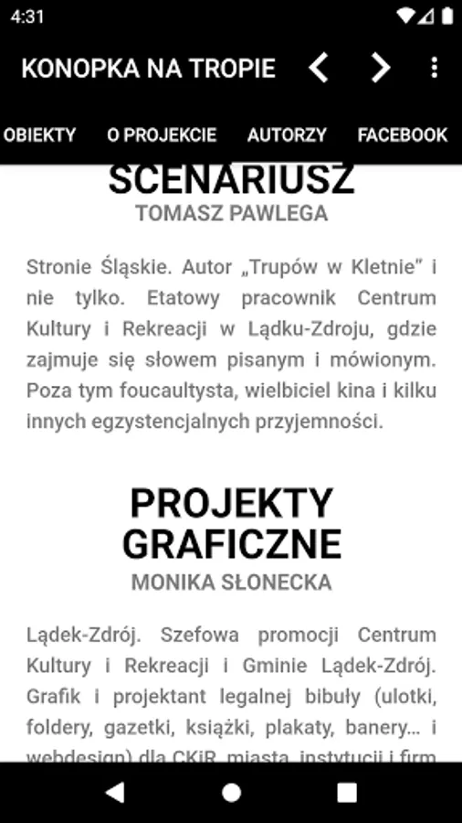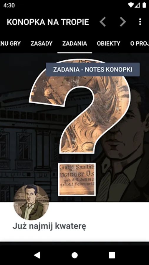 "Kapitan Konopka na tropie" is a "tourist crime game" in Lądek-Zdrój. Following in the footsteps of Captain Stanisław Konopka, you will meet not only the tangled mind of the psychopathic criminal Morawiecki, but you will also get to know the nooks and crannies of Lądek-Zdrój, details and artifacts that ordinary tourists, and often also residents, do not have the opportunity to catch. The application is a mobile version of Captain Konopka's notebook, it contains a list of puzzles and additional information. The game finale takes place in the real world, but you will learn more after reading the case file.