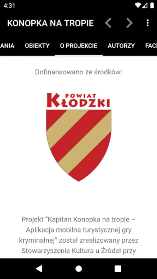 Join the investigation. The project "Captain Konopka on the trail - mobile application of a tourist crime game" is co-financed from the budget of the Kłodzko County.