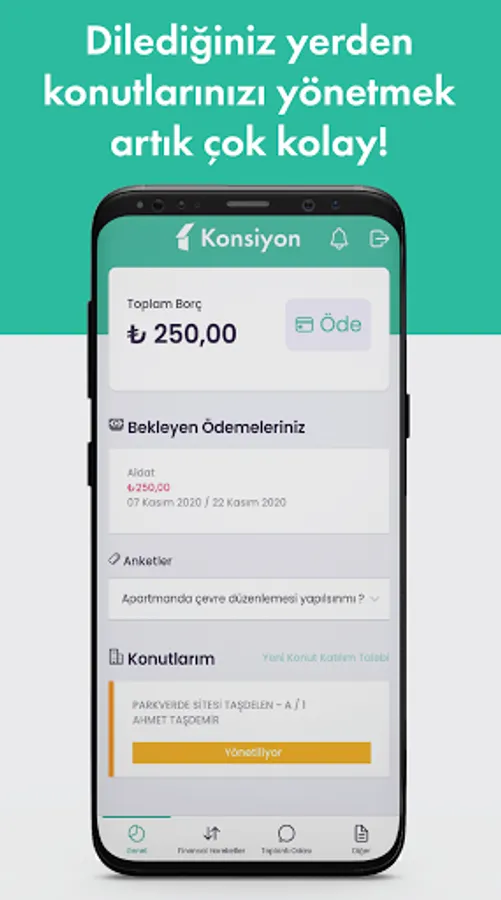 Paying or managing your dues to dues, natural gas, fixtures and management has never been easier than before in the residence management automation site, apartment, residence or workplace! You can easily make all your payments and all your requests and transactions related to your site through Konsyon. In addition, it is a platform that provides great benefits and convenience for site management, dues follow-up, delay interest tracking, account balances and payment tracking, announcements and notifications to site residents.
