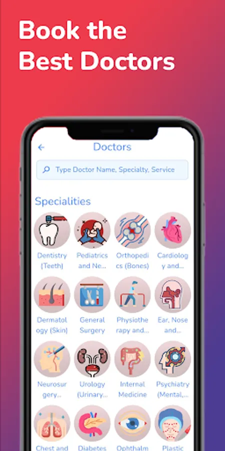 1- Book Doctors, in-clinic, Hospital, Medical center in all specialties, you can select doctor in more than 45 specialties, including Dermatology, Dentistry, Ophthalmology, Psychiatry, Neurology, Pediatrics, Orthopedics, Gynecology and many more.