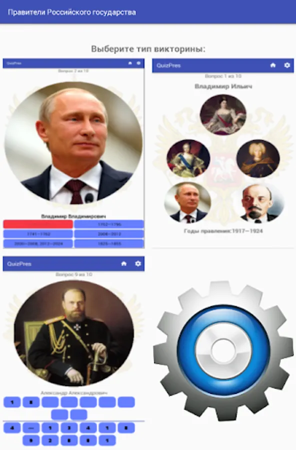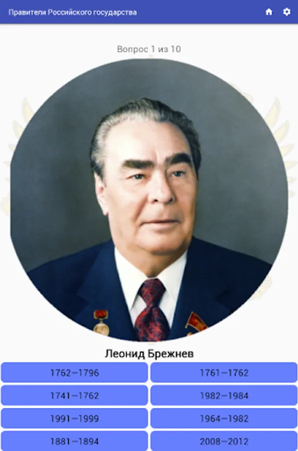 The settings will help to complicate or simplify the passed tests; there is an opportunity to switch to studying the dates of statesmen. The quiz is adapted for various screen resolutions.