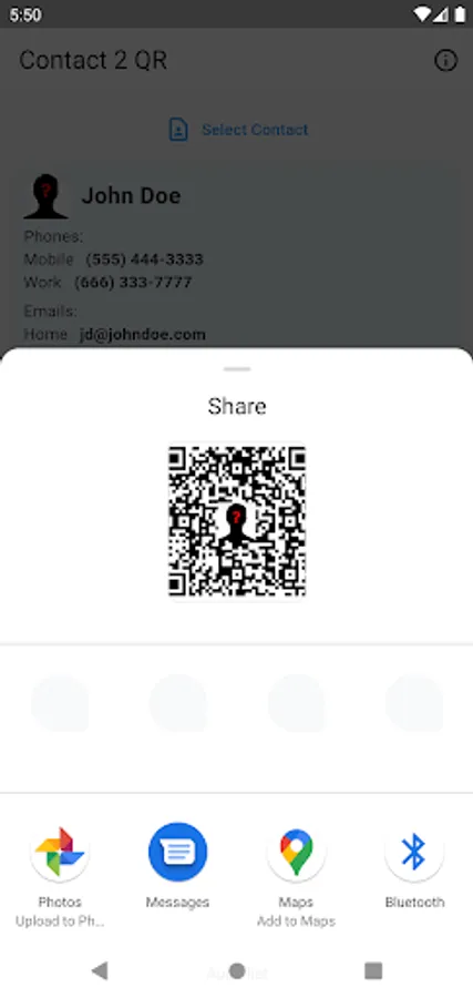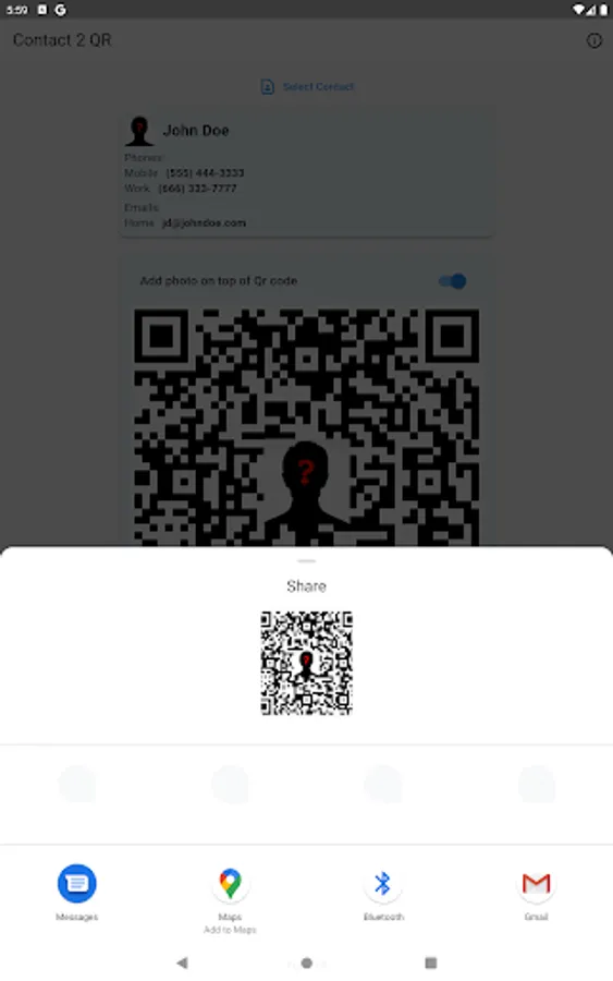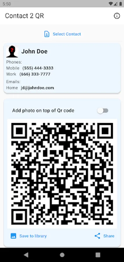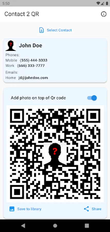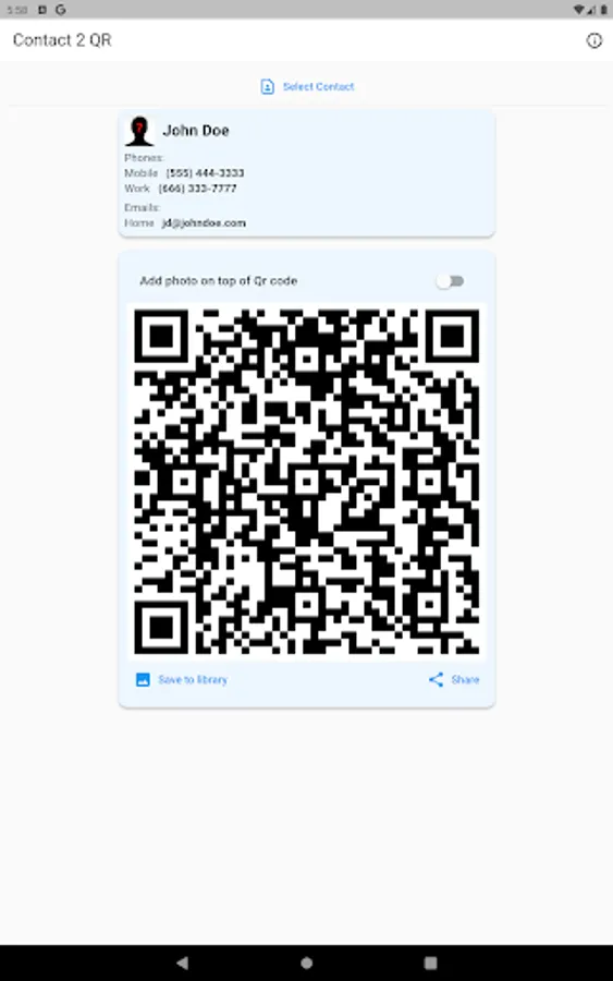 Contact 2 QR is an amazing application that lets you convert your contacts information into QR codes that you can easily share with anyone. No more typing or spelling errors, just scan the code and save the contact in your phone. You can also customize the QR codes with different colors and shapes to make them more attractive and personal. Contact 2 QR is the ultimate tool for networking and socializing in the digital age. Download it now and start sharing your contacts in a fun and convenient way!