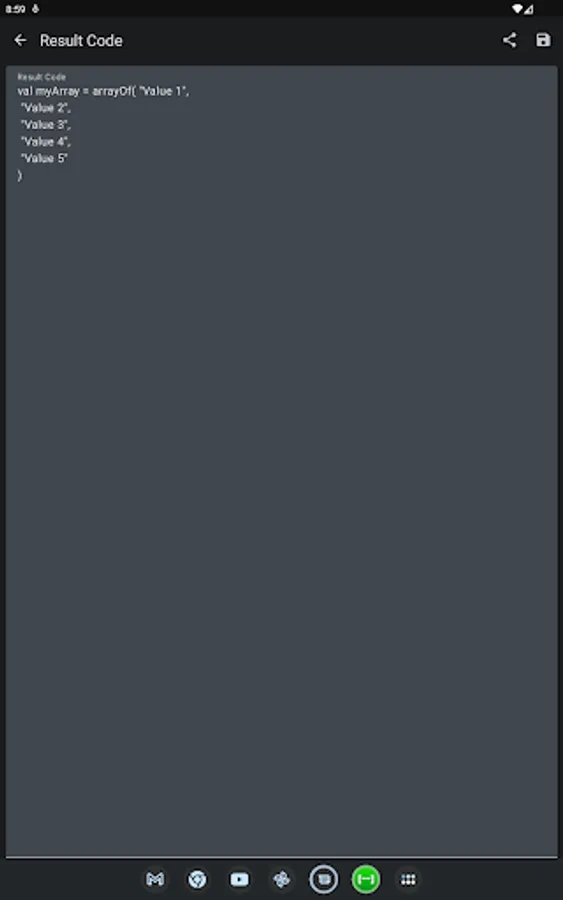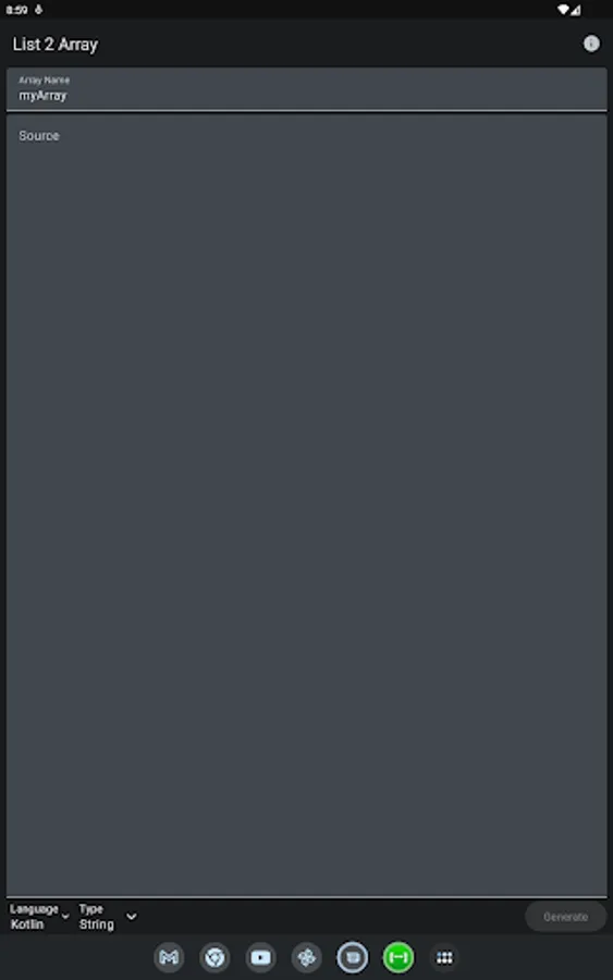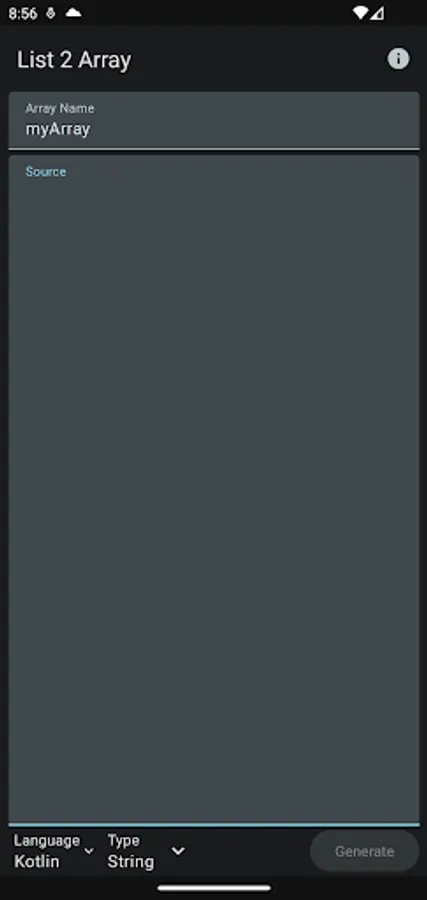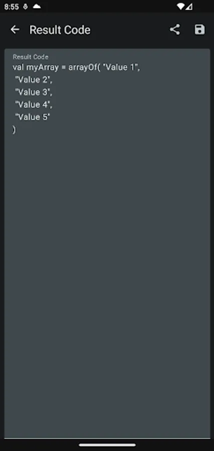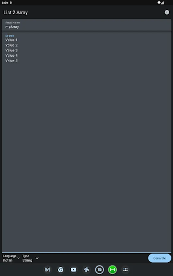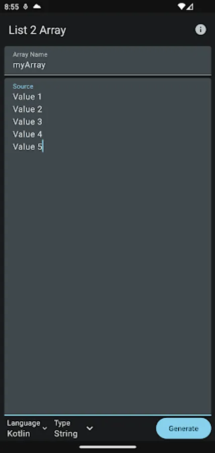 List 2 Array is an application that helps you transform any list of data into an array declaration for different programming languages. You can choose from Kotlin, Java, Dart, C#, Swift, or Python as the target language. The application also lets you share or save the result to your device storage with ease. List 2 Array is a simple and useful tool for developers who need to convert lists into arrays quickly and accurately.