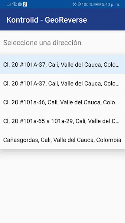 To use it from KontroliD, a text type question is included in the form, apparently placing the call to the external application with the corresponding parameters. On the mobile, you will see the Start button that activates the application and then you will see the selection list with the alternative addresses that Android determines as the closest addresses and then the selected one is returned: