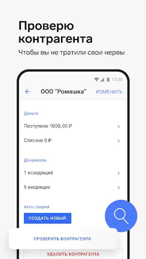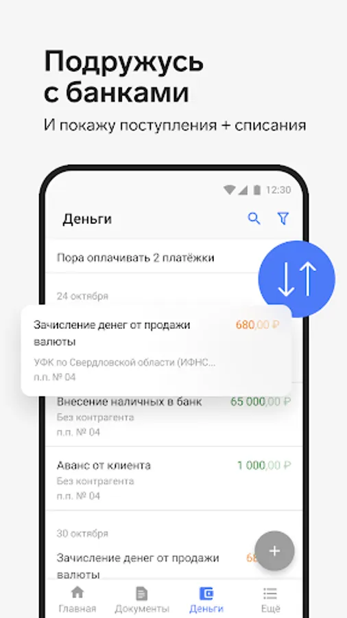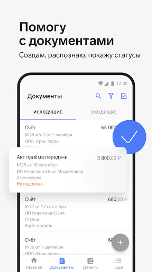 Create contracts, invoices, acts, invoices and UPD. All documents can be easily sent to counterparties, and incoming documents can be added using photo recognition.