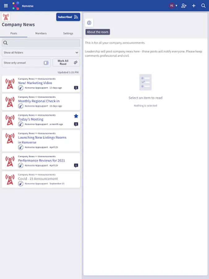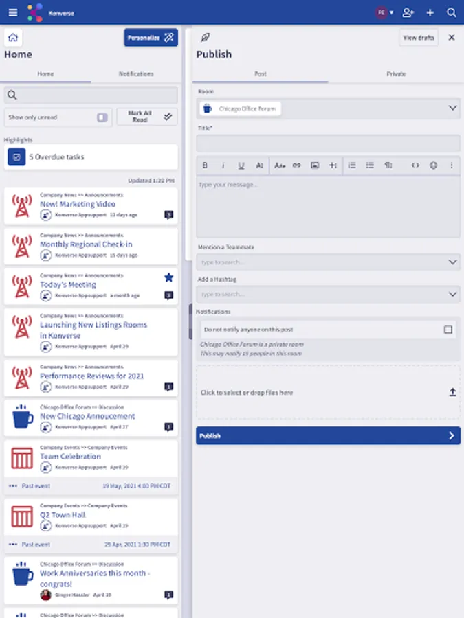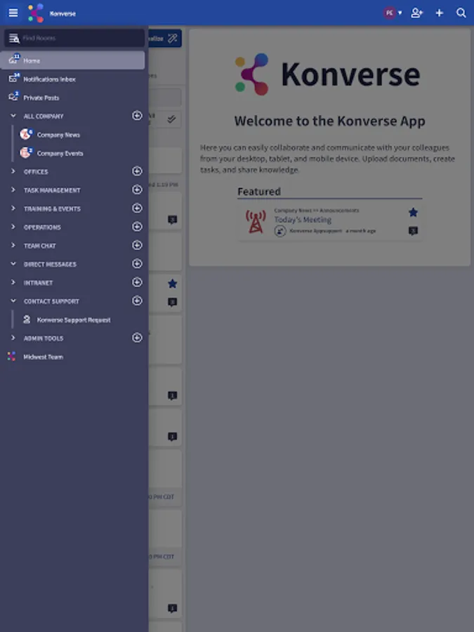 Konverse replaces internal emailing, shared drives, and intranets with a more intuitive, all-in-one communications app accessible via desktop and mobile. Users join a room dedicated to a specific project or job function, start conversations, and create or consume valuable working knowledge. By creating more structure around messaging, Konverse simplifies best practice and information sharing, reduces redundant transactional messaging, and fosters a unique team culture that promotes productivity and teamwork.