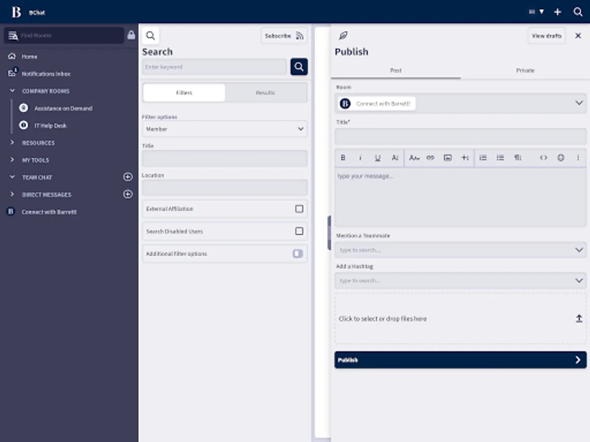 BChat replaces internal emailing, shared drives, and intranets with a more intuitive, all-in-one communications app accessible via desktop and mobile. Users join a loop or room dedicated to a specific project or job function, start conversations, and create or consume valuable working knowledge. By creating more structure around messaging, BChat simplifies best practice and information sharing, reduces redundant transactional messaging, and fosters a unique team culture that promotes productivity and teamwork.