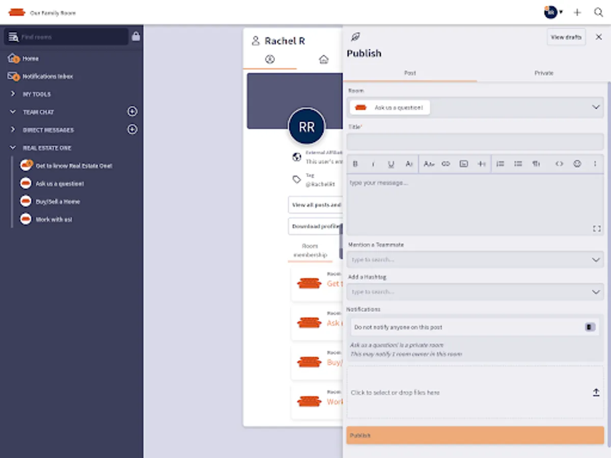 Real Estate One replaces internal emailing, shared drives, and intranets with a more intuitive, all-in-one communications app accessible via desktop and mobile. Users join a loop or room dedicated to a specific project or job function, start conversations, and create or consume valuable working knowledge. By creating more structure around messaging, Real Estate One simplifies best practice and information sharing, reduces redundant transactional messaging, and fosters a unique team culture that promotes productivity and teamwork.