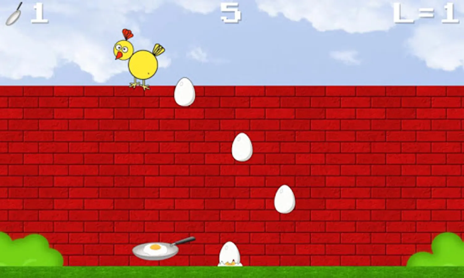 Grab your pan and try to catch the eggs dropped by the chicken!