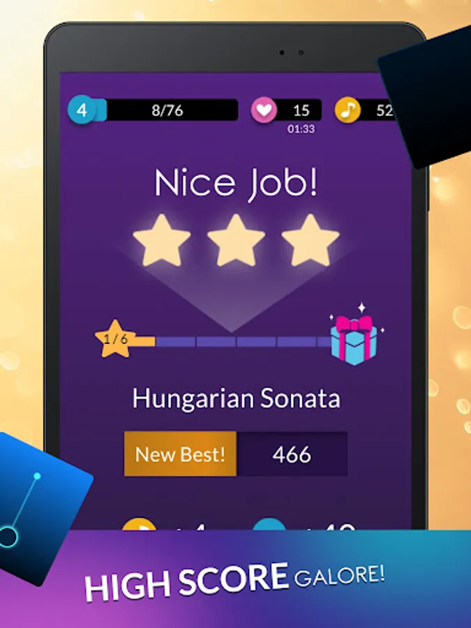 - Play piano songs and hit 6 milestones in each song: earn up to 3 stars then up to 3 trophies