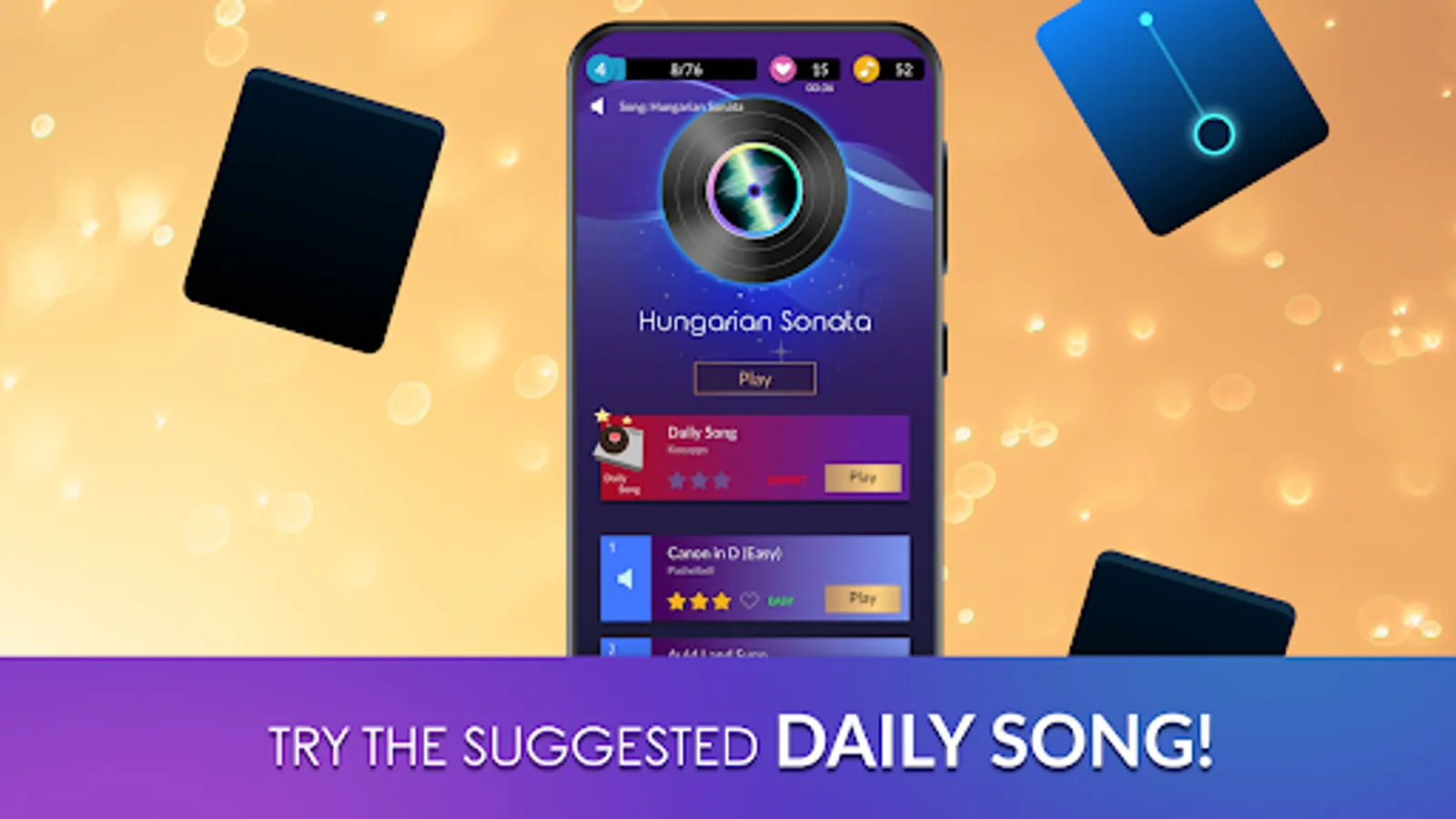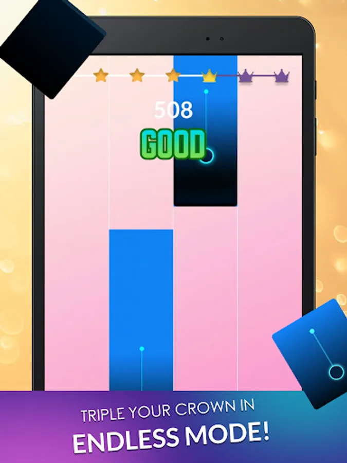 Tap and keep playing to gain experience and unlock more songs to play. Play piano songs and hit 6 milestones in each song - earn up to 3 stars then up to 3 trophies. Make music, test your dexterity and see how long you can keep playing in Endless mode.